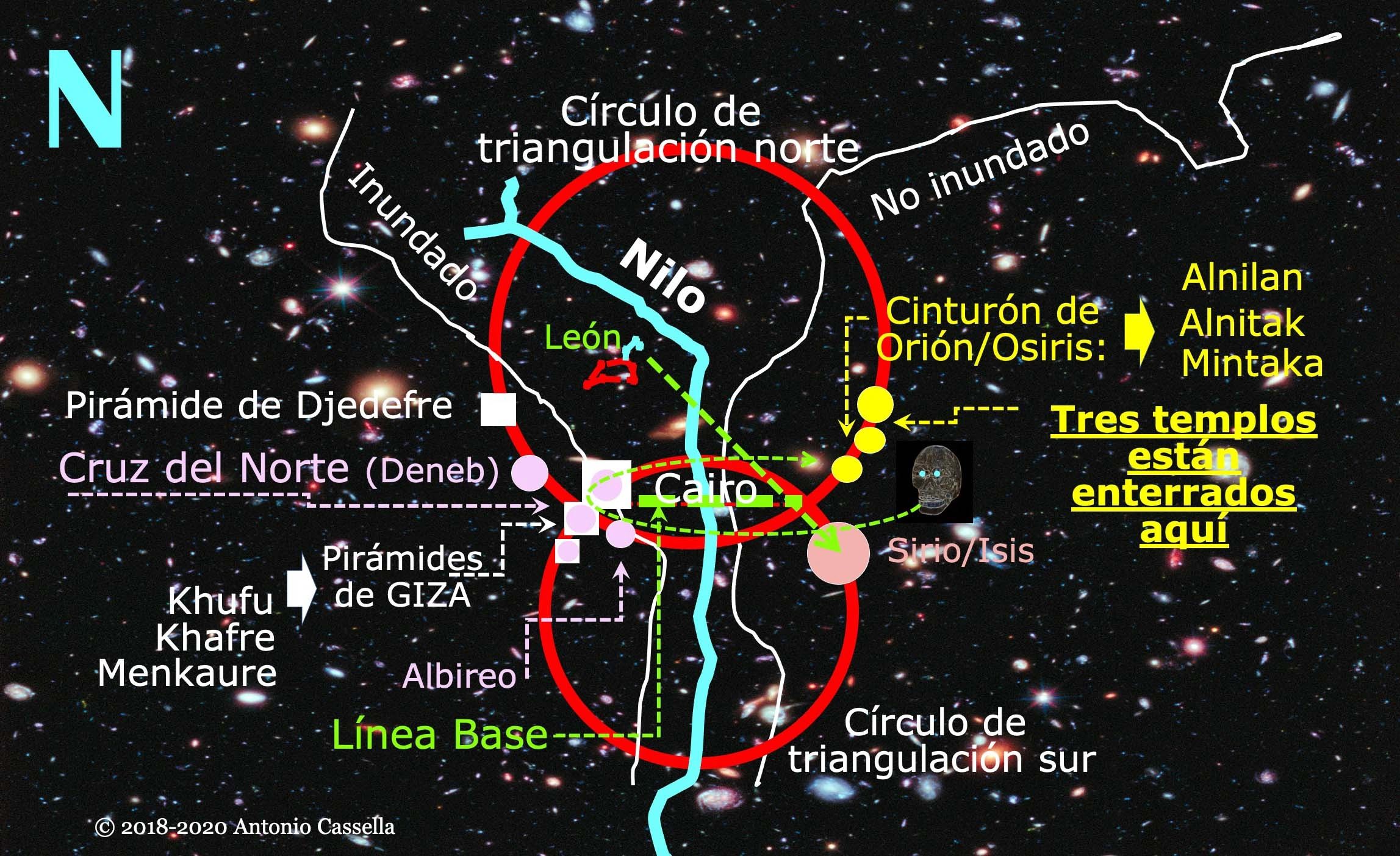 Cassella (2018i) planteó también la hipótesis que el cruce de los dos círculos en tierra y las 4 pirámides ubicadas en ellos constituían una triangulación de primer grado, que permitía a los faraones reconstruir algunas señales clave después de las inundaciones milagrosas del Nilo.