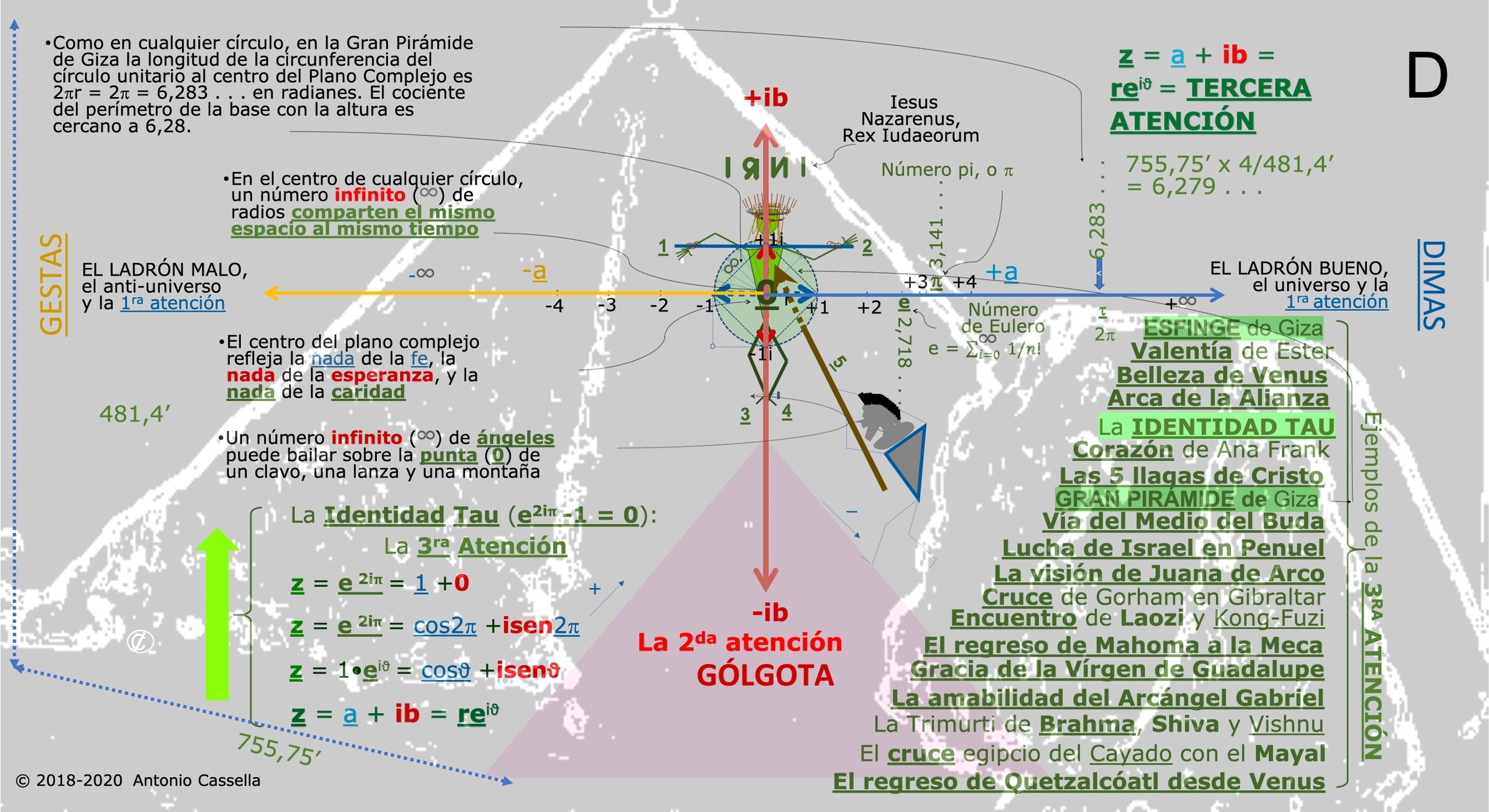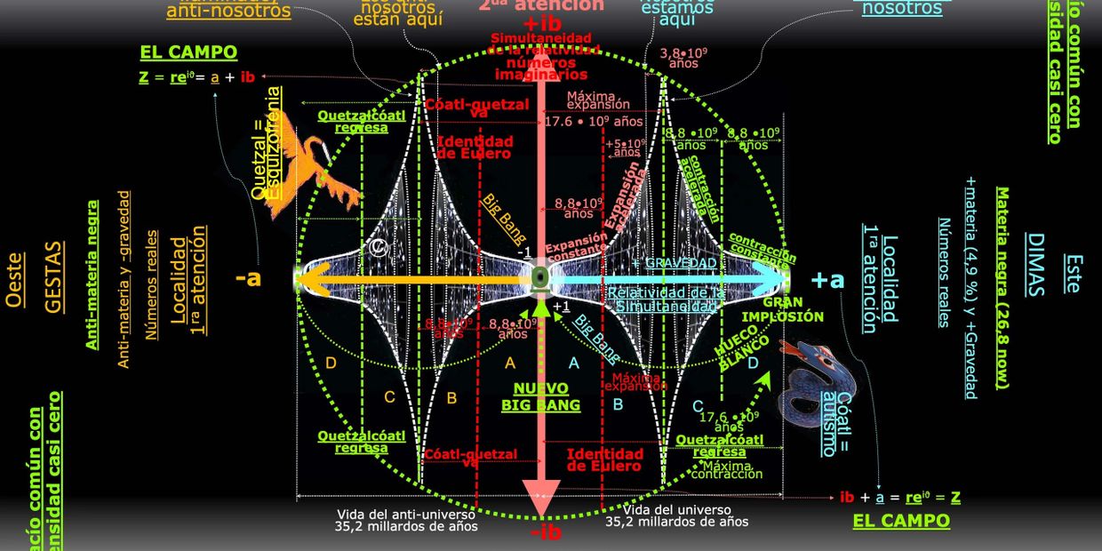 Las 4 divisiones de 8,8 millardos de años, a la derecha para el universo y a la izquierda para el anti-universo, reflejan los 4 cuadrantes del plano complejo que acoge la realización circular de la Identidad Tau en sus dos posibilidades: