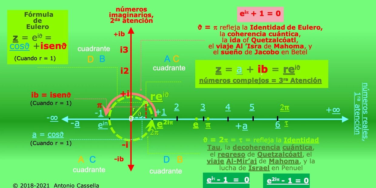 En segundo lugar, la Identidad de Eulero reflejaría la coherencia cuántica que va en pos de la esquizofrenia (-1), recorriendo dos cuadrantes en sentido anti-horario; y, en tercer lugar, si uno quisiera regresar a la realidad del espaciotiempo autístico (+1), en el eje de las aes, el ángulo theta a considerarse debiera abarcar 4 cuadrantes, en correspondencia con un ángulo el doble del pi griego, denominado Tau en la literatura.