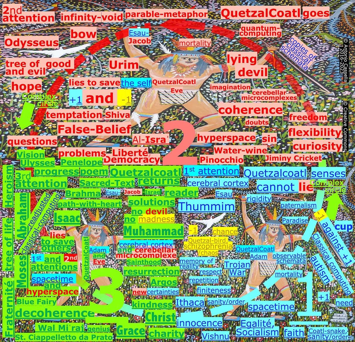 As in the top-half complex circle of the figure above, our genes help our devilish quantum coherence (2) to stay in our autistic (+1, blue) and our schizophrenic (-1, orange) facets at once (infinite speed). Our genes lead 99% of us to join the devil (from 1 to 2). Yet fleeing the devil and folly is tough. A saintly heart allows us to return to a re-created autistic facet via the 3rd attention. As Matthew (22:14, KJV) says: " For many are called (red, 2) but few are chosen" (green, 3). That happens in a complex circle in which we lie to save others. As Luke (1: 28, KJV) says in the "Hail Mary": Blessed art thou among women." If a solution (Mary) precedes possible solutions (women), some dreams are blessed, although most are fiction.