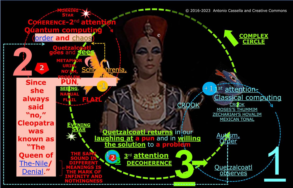 Cleopatra crossed classical computing (the blue crook, autism, and +1 on the right of the figure above) with quantum computing (the red flail and comedian-liars at the left, in the coherence by which Quetzalcoatl goes). Before meeting decoherence (green, complex circle) in Giza's Sphinx, Cleopatra met the power (the bow or Moses's Urim) that pulls opposite muscles of our mouth at once when we laugh, fills with tears our eyes together when we cry, makes us laugh and cry simultaneously, or makes us dream.