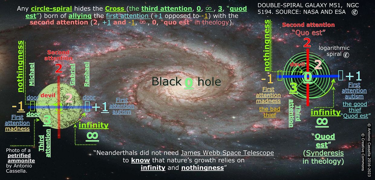 The petrified ammonite at left tells us that nature returns from nothingness to infinity in ruling the billion cells that compose a snail. Similarly, the black hole at the center of a double-spiral galaxy (e.g., M51, NGC 5194) feeds the life of that galaxy.