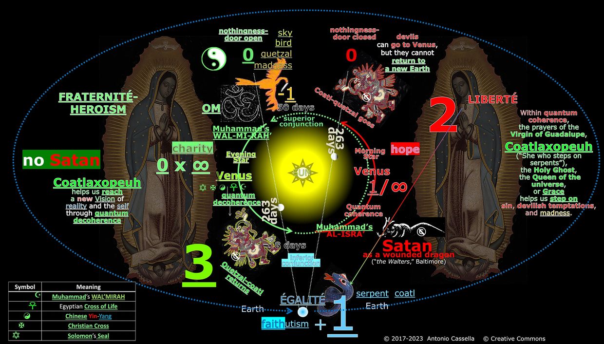 Muhammad showed us in his night flight on the winged half-mule Buraq that any return implies a previous going. As Abraham (the first Hajj pilgrim to Makkah) built the Kaaba in Makkah near the Zamzam well and turned left 7 times, a counterclockwise rotation renews our three attentions and the Grace of the Virgin Mary stops the devil (2) and madness (1) from returning (3). His 1st and 2nd attention became returning decoherence (the 3rd attention) in a Christ Who flew over the Sea of Galilee (John 6: 1-70, KJV). Nine centuries before Christ, an Aztec-Coatlaxopeuh-Holy ghost, preceded Mary as mother of a laughing Quetzalcoatl.