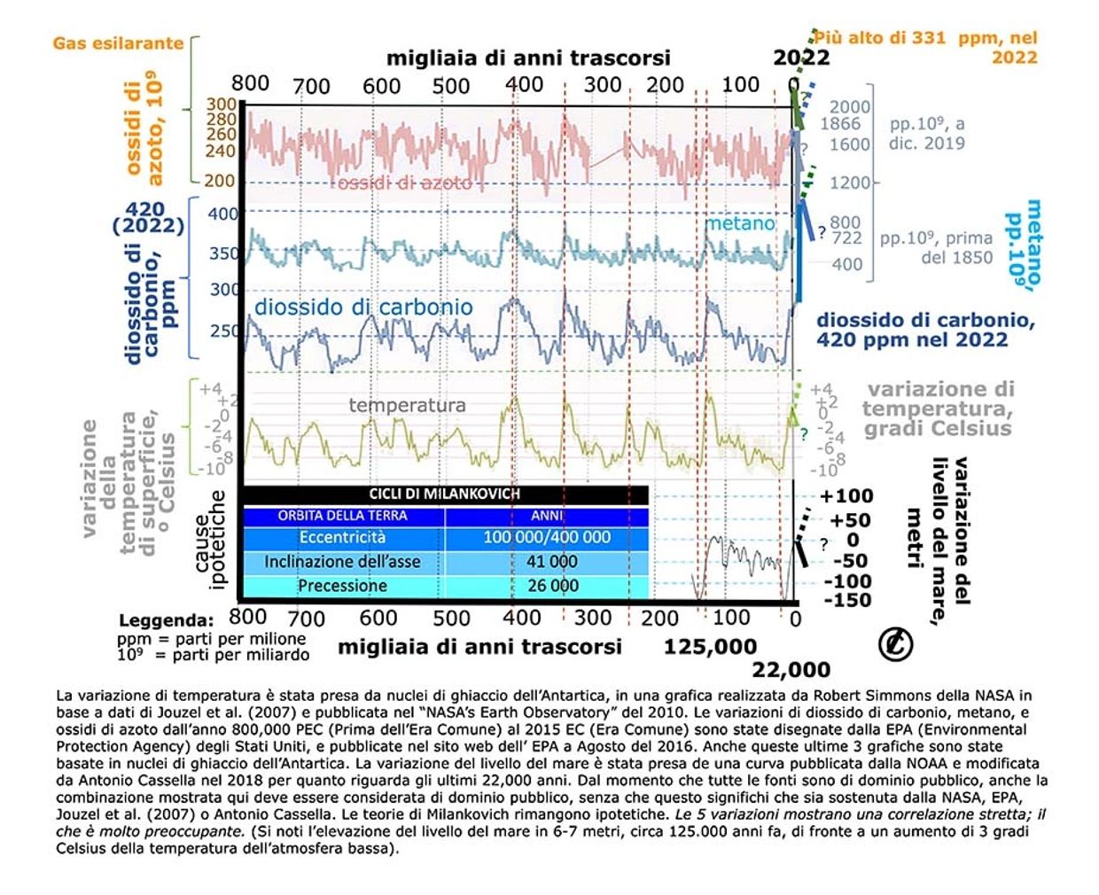 Il diossido di carbonio nell'atmosfera terrestre, per esempio, è andato su da una media di 240 ppm (parti per milione) in 800 mila anni a 420 ppm nel 2022. E così è successo pure agli altri due gas serra. Ovviamente, la temperatura dell'atmosfera bassa ed il livello del mare aumenteranno. Non è possibile bruciare senza conseguenze in un attimo geologico il carbone, il petrolio, ed il gas che si sono accumulati nella crosta terrestre durante milioni di anni.