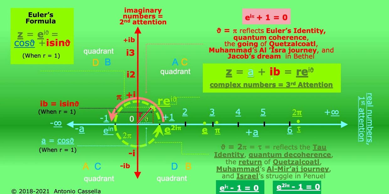 In the second place, he considered that Euler's Identity reflects the quantum coherence that reaches schizophrenia (-1) in two quadrants (blue A and B); and, in the third place, that if we were to return to the sanity of mental spacetime in the real axis, the angle to be adopted would have to be twice Greek Pi, or Tau.
