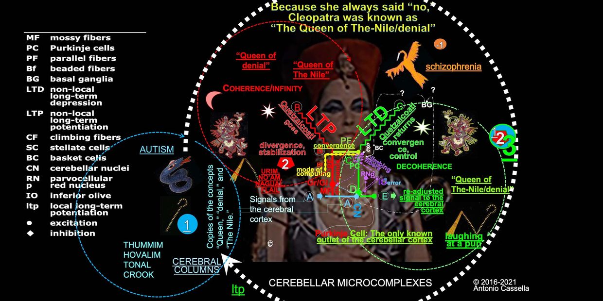 The figure above depicts the major traits of the neural circuitry that underlies the crossing of our cerebral capacity to faithfully remember the known and our cerebellar quantum computing capacity to overcome the ambiguity of polyvalent words, by harmonizing seemingly unrelated, or competing, pieces of information,